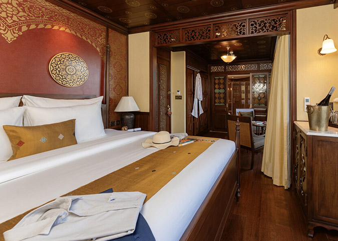 The two lavishing Suites are on the upper deck and each has the area of 30 square meter accompanied with a 3 square meter private balcony. All of them are located in the bow section of the cruise and decorated in the most exquisite furniture from the local artisans.