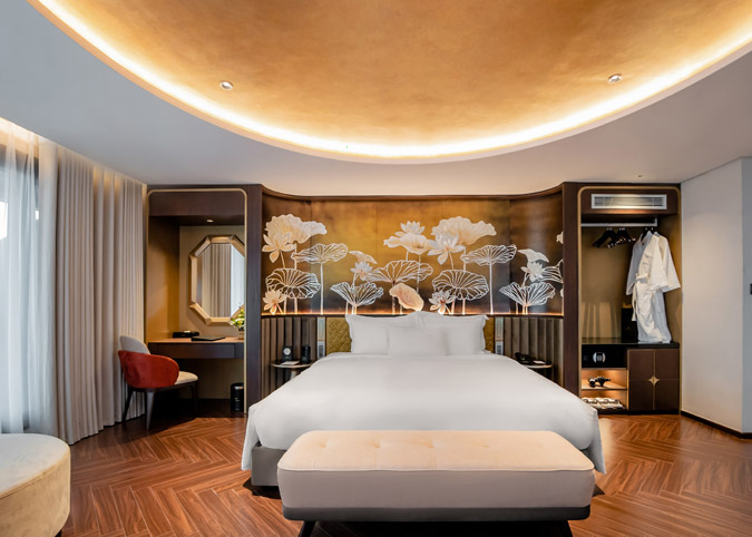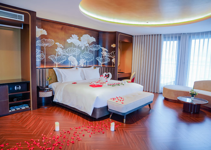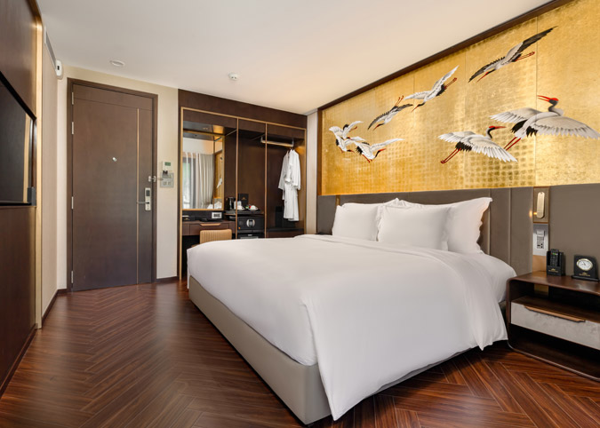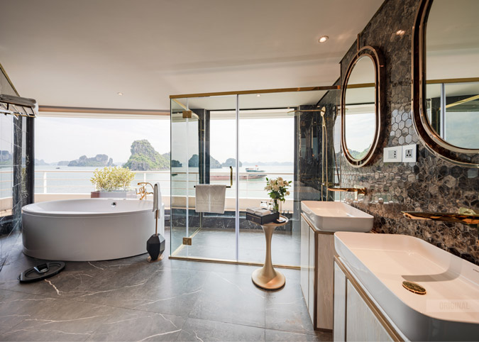 If you are traveling with a couple or a small family, this space provides a cozy yet elegant setting for your cruise. The Deluxe Room offers 30 sqm of space with a luxurious design, and it is located on the first floor, combining elegant and modern amenities. You'll have the opportunity to enjoy breathtaking sunrises from your private retreat in Halong Bay. Why not come and experience this cruise for yourself?