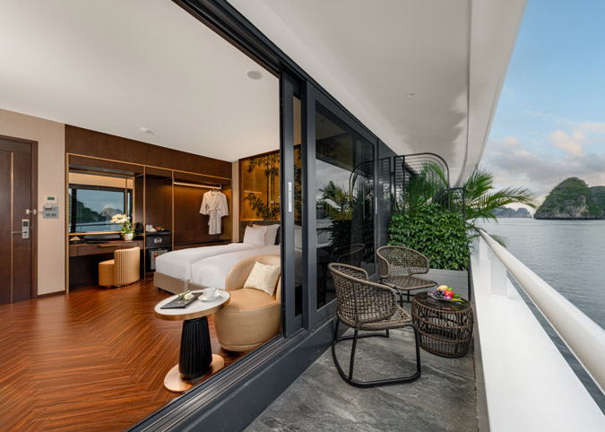 All types of rooms on the cruise have a balcony. The private balcony offers stunning views of Halong Bay, giving you a peaceful spot to soak in the scenery.