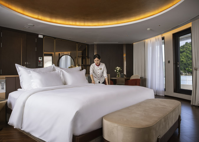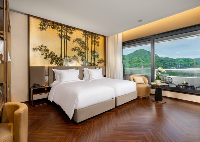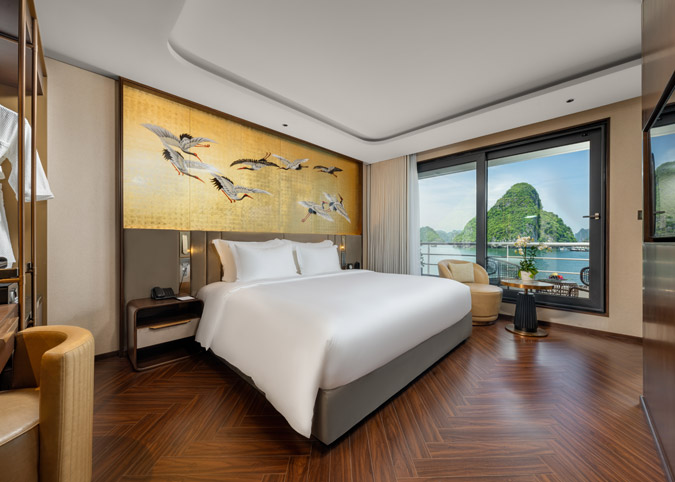 The Premium Executive Room, located on the upper decks, spans 30 sqm and guarantees privacy and tranquility. It offers unparalleled views of Halong Bay, catering to guests who demand a serene and exclusive experience with elevated bay views.
